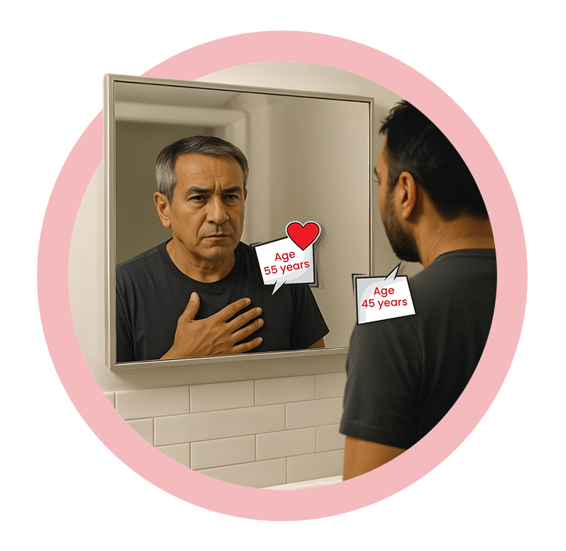 Compared to a person of the same age , sex ( at birth ) and ethnicity who has no additional risk factors that could affect their heart . On average , people giving these responses live to the age of without having a heart attack or stroke